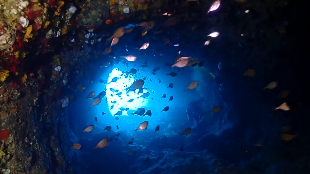 【宮崎県延岡市 2020.1.5撮影】延岡の大人気ダイビングポイント「L字トンネル」の横穴(トンネル)の水中動画です。トンネル内には魚がわんさかいるし、イセエビなども隠れています。また壁面にはカラフルなサンゴも付いていてとても綺麗なトンネル...