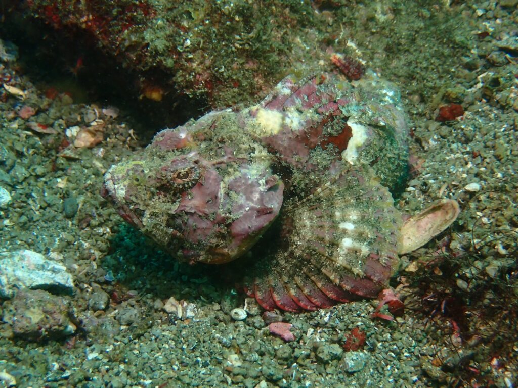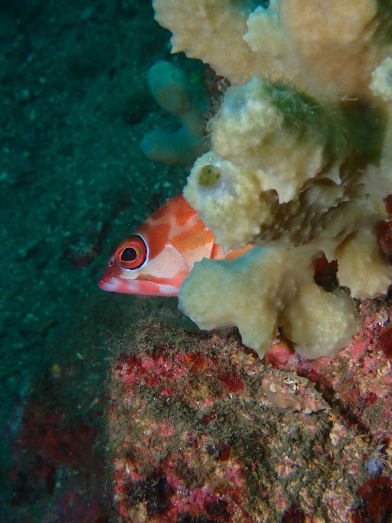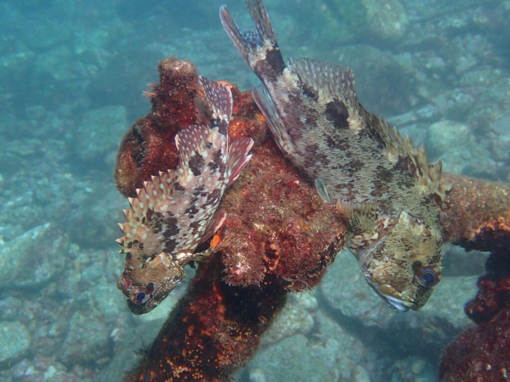 カイメンからひょっこりと顔を出すアカハタや、サイズの比べっこをしているカサゴに、石に擬態をしているサツマカサゴもいました♪