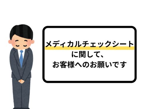 メディカルチェックシート、及び医師のサインの有効期限に関しては、ご自身で管理をお願いいたします。提出時期は皆さまそれぞれ違い、サインが必要な治療などを始められる時期と提出時期が異なる方も多いため、当店だけでは管理しきれずご自身での把握のご協力をお願い致します。