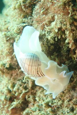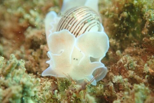 このミスガイの黒い目がなんとも可愛らしくて♡ 貝が外に剥き出しになっているウミウシ珍しいですよね^ ^