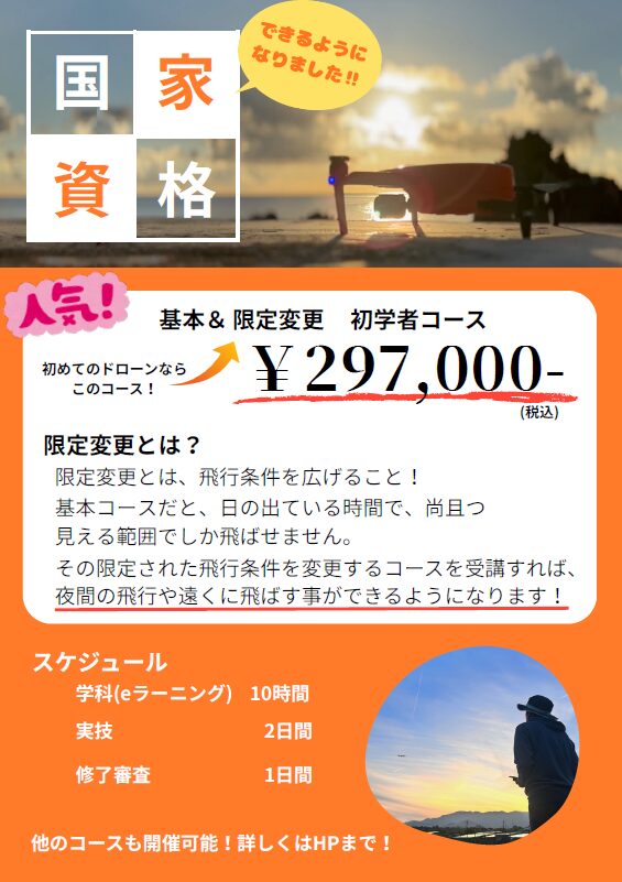 昨年夏より、ついに「二等無人航空機操縦士」の国家資格コースが開催出来るようになりました!まだ1年も経っていませんが、何人かのお客さまにご参加いただき、国家資格を取得されました♪