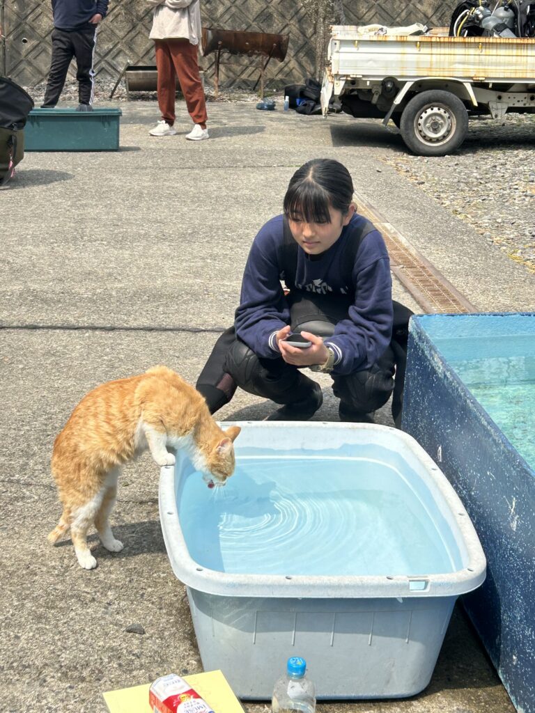 休憩の合間に猫ちゃんと♪この子は元飼い猫のようで、膝の上に乗ってきます。